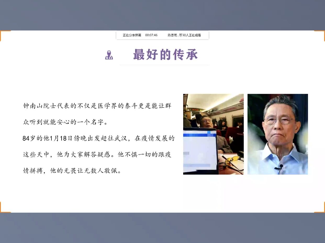 本次團組織生活以觀看防疫主題新聞視頻、訪談視頻為主,兼有同學自由發言的方式展示疫情形勢及前線醫護人員的奉獻事跡。在團組織說明活動相關事宜及奏團歌后,班長以文字、圖片的方式,輔以語音的講解,從感染人數、持續時間及對社會的影響,多方面介紹了此次疫情的整體情況,完善同學對疫情的了解。接著,通過放映新聞視頻、鐘南山專家的訪談視頻及醫護人員的采訪視頻,讓同學們從新聞事實報道、專家建議及評論、醫護人員的奮戰事跡及感想,多元立體的了解了疫情期間不同人群的感受和體會,更直觀的感受到疫情肆虐下千千萬萬毅然趕赴抗疫前線的英雄,用自己的血肉之軀筑起了一道守護人民健康的防護線,不計生死,不求回報。最后以PPT總結的方式,概括了本次團組織生活的主題及要點,確保人人參與且有收獲的情況下,圓滿結束了本次的團組織生活。