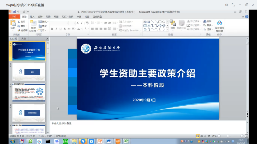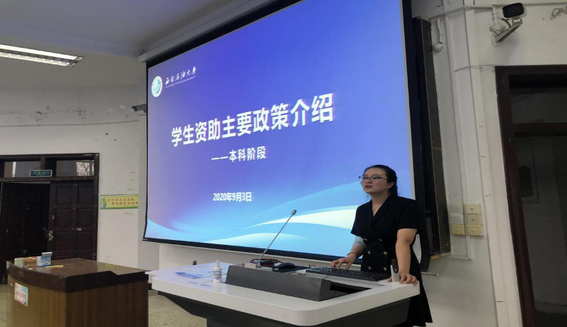 同時楊老師開展了資助政策一堂課的宣講,對本科階段的學生資助主要政策進行介紹。分別從學校資助體系、獎助學金、生源地貸款、國家助學貸款等方面對資助政策展開了詳細的宣講,進行了細致的政策解讀,為今后的資助工作做好準備。