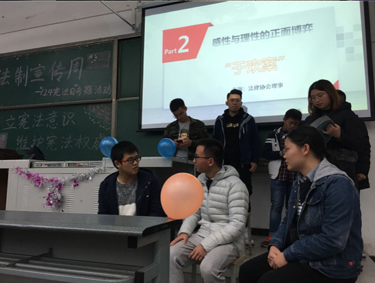 大風起兮,憲法進校。為引導大學生貫徹法治精神,學習憲法知識,法學院法律協會于12月7日下午三點在明辨樓c205舉行了憲法日專題活動。眾望公益負責人唐鳴帥、廖波、余文娟出席本次活動。