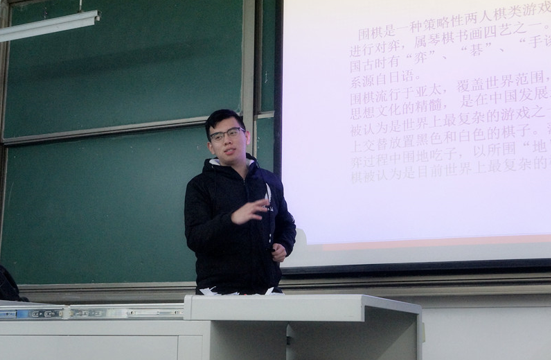 游戲后是我們的“棋”講堂,圍棋起源于中國,傳為堯作,春秋戰國時代即有記載,隋唐時經朝鮮傳入日本,流傳到歐美各國。有學者認為,圍棋蘊含著漢民族文化的豐富內涵,是中國文化與文明的體現。主講人直接以實體教學為我們講述了棋的各個方面的知識,著實收獲頗豐。