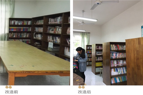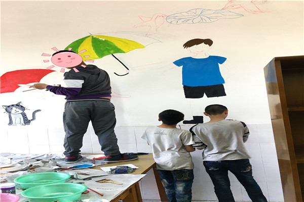 上午9時,志愿者們首先迎來的挑戰是對圖書室進行打掃、重新布局和開始墻繪的初稿。盡管圖書室的面積較小,但四周都是塞著滿滿當當的圖書的書柜,這給打掃房間帶來了極大的挑戰。志愿者們干勁十足,孩子們也毫不退讓,圖書室的重新布局在大家的共同努力下圓滿完成。在此次改造中,志愿者們用心思索,決定專門留出一面白墻用來彩繪,為這里的特教學生們提供可以肆意揮灑自己的想象力和創造力的地方,繪制屬于他們的王國。面對這面潔白平整的墻壁,孩子們開始時都不敢嘗試,擔心畫不好,但在志愿者們的鼓勵和示范下,特教學生們終于鼓起勇氣,將夢想訴諸畫筆,讓這面普通的墻立即被賦予了生機和活力,這面墻不僅寄托著特教學生們的美好愿望、更寄托著志愿者們對孩子們的殷切希望。