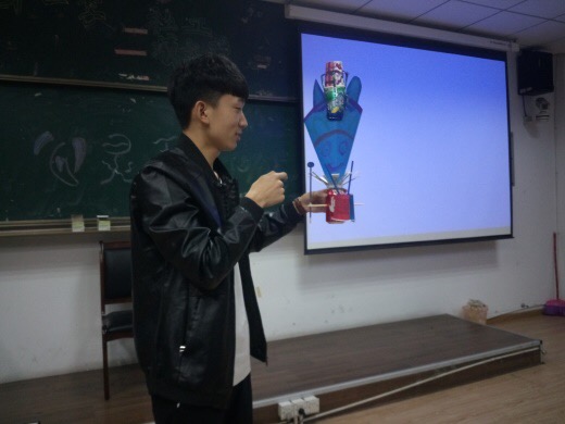 在破冰活動后,營員隨機圍坐成四個小組。小組成員在激烈討論后,開始動手改造廢舊材料。20分鐘后,四個組相繼完成了手工制作,并分別派出一名代表,依次上臺介紹組員的成果。