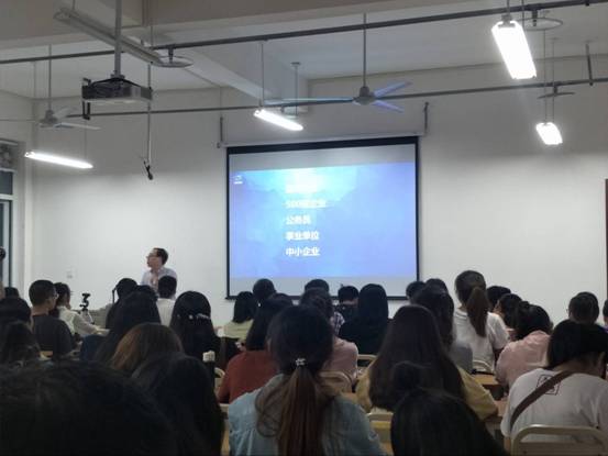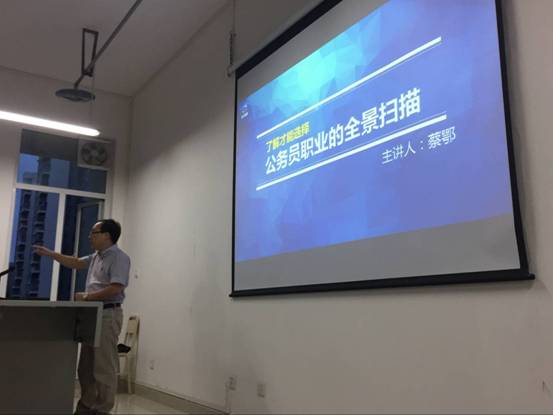 蔡鄂老師擁有兩年行政機關工作經驗,8年公職培訓行業工作經驗,對于同學們心儀的職業發展方向有清楚的了解。講座中,蔡老師為同學們逐個分享了國有企業、500強企業、公務員、事業單位、中小企業等工作選擇的發展前景,以此幫助同學們明確目標。