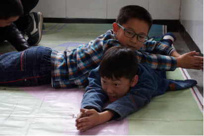 下課鈴一響,孩子們陸續來到教室,活動正式開始。首先以“123木頭人”游戲作暖身?!澳绢^人”們姿態不一,以自己獨特的步伐行走在地步上,隨著口令聲而變換形態?!?23木頭...恐龍!”大家紛紛定格成恐龍張牙舞爪,還有木頭魚、木頭豬、木頭大象,孩子們有的以手作長鼻,有的交叉著雙手,在地上匍匐前進,更憑著想象模擬大象哭泣、開心、難過的不同聲音。有趣的是,與孩子一同游戲的志愿者們還站立著時,孩子們早已幻化無窮,在地布上“飛天遁地”,無所顧忌,充滿童趣和無邊的想象,只管嬉笑與歡樂,釋放天性。想象力游戲不僅僅是肢體與語言的開發,其中愉悅的氛圍亦能對孩子們的情緒發展產生良好影響,促進樂觀進取個性的培養。