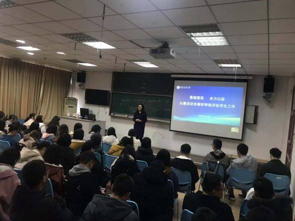 為迎接即將到來的本科教學工作審核評估專家組現場考察,幫助師生更好了解和熟悉審核評估的相關知識,立體地展現學校在本科教學、人才培養、師資隊伍建設等方面取得的成績,法學院2016級輔導員肖丹老師于11月21日下午16:30面向16級全體在校學生在博學樓社工實驗室召開了以“落細落實、全力以赴,以最優狀態做好審核評估學生工作”為主題的大會。