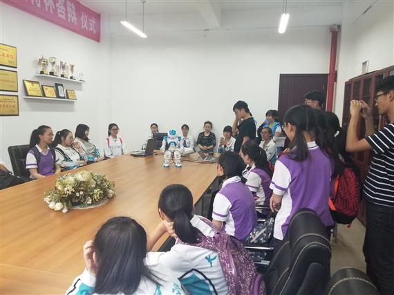 步入明理樓大彎中學的同學們分成了男女生兩組,男生先于B319參觀了智慧城市沙盤系統,了解現代城市在高新信息技術的支持下在智能性,安全性和便利性上的提升。向同學們介紹沙盤系統的老師誠摯地發出號召,鼓勵同學們將來加入西南石油大學計科院,學習新時代的先進的信息技術,為成為智慧型人才而奮斗!另一邊,女生組在B308參觀了人機交互機器人及其演示。在24個同學的包圍之下,機器人害羞地連連捂面,引得同學們笑的前俯后仰。途中,交互機器人向同學們提出問題,并與同學們玩起“你比劃我猜”的游戲,伴隨著突如其來的音樂聲,機器人居然跳起舞來!同學們都被機器人的智能程度所震撼,切實了解到信息技術對當今世界的推動。