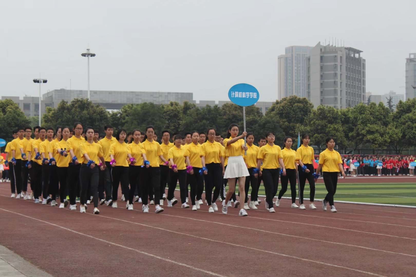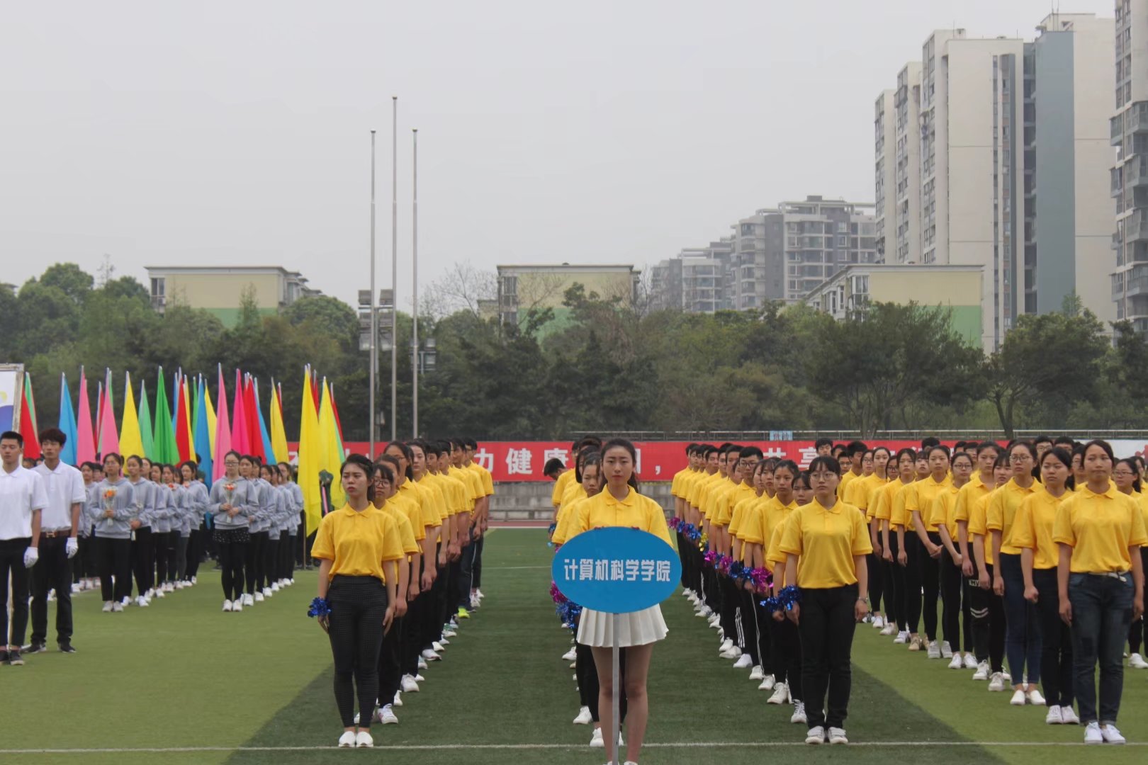 在《運動員進行曲》的背景下,國旗方隊舉著鮮艷的國旗走向主席臺,緊隨其后的是彩旗隊、鮮花隊及各院方陣。他們精神抖擻,邁著整齊的步伐,呼著嘹亮的口號踏步走過。計科院的方陣第三個入場,他們手持花環,昂首挺胸,行至主席臺前時,齊聲高喊:“劈波斬浪,勇攀高峰。計科計科,誰與爭鋒”,引得臺上的觀眾一陣歡呼。方陣表演結束后,裁判員代表及運動員代表分別進行宣誓。在整齊劃一、積極向上的排舞表演結束后,學校黨委書記孫一平宣布西南石油第四十一屆田徑運動會正式開始。