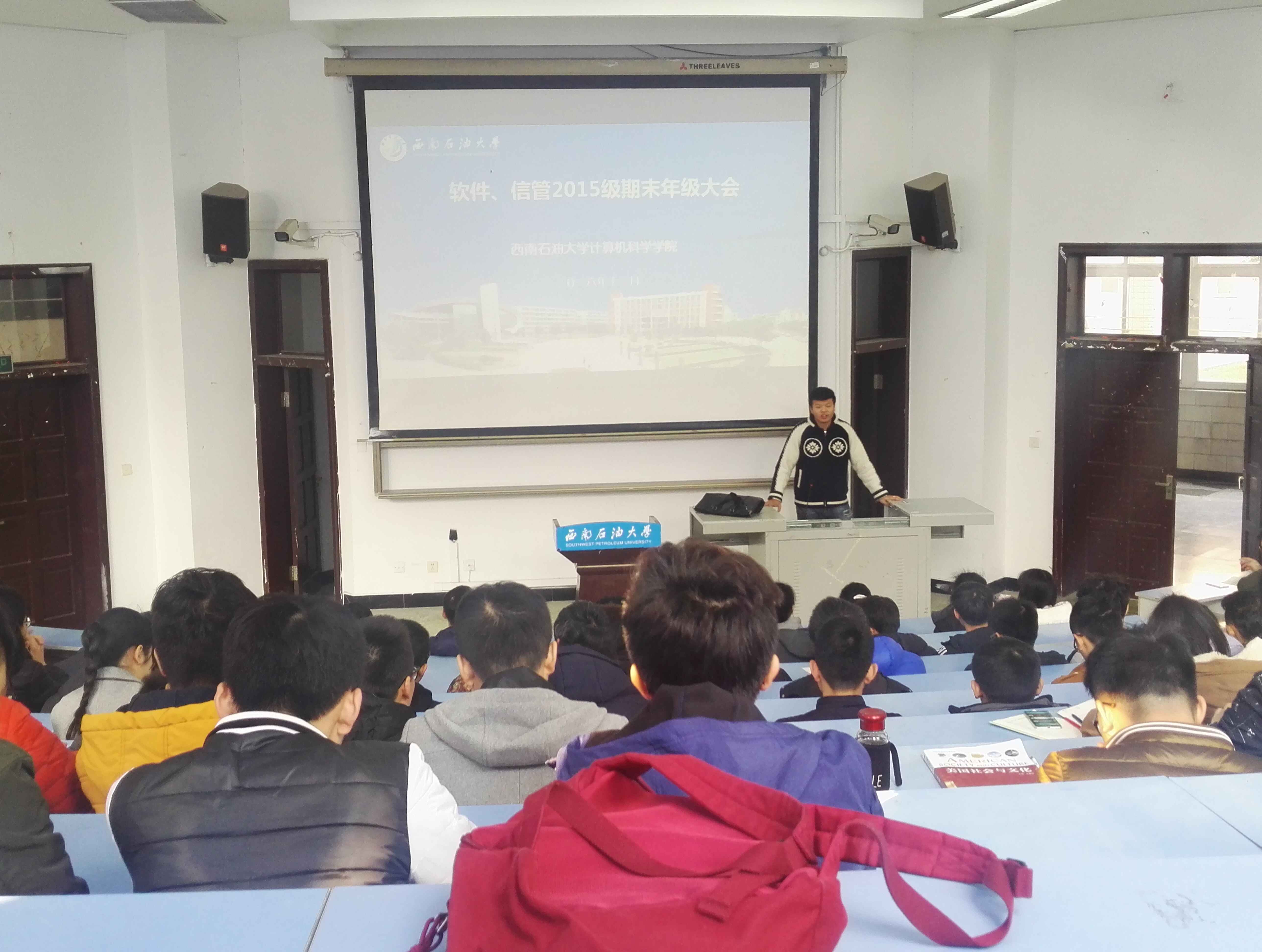 12月28日至1月5日,計算機科學學院分專業、年級召開了期末誠信迎考暨寒假安全教育大會,本次期末總結會由計科院團委書記劉翔組織,計科院全體輔導員共同參與。其中新生輔導員高晗雨、吉子日赫對2016級新生入學以來所展現出的班風、學風以及宿風進行了總結,對同學們在本期軍訓中所表現出的吃苦耐勞和努力拼搏精神進行了肯定,對剛剛升入大學還未適應大學生活的同學進行了勉勵,鼓勵新生們在期末積極備考,誠信應考。而輔導員鄧璨、楊烽則主要從當前大二學生的學習成績入手,通過對學校相關政策進行解讀,讓同學將自身當前的學習成績狀況與之比較,喚醒同學們的警惕意識,慎重應對即將到來的期末考試,避免在大二結束階段面臨學業警示、降級、甚至退學的困境。針對高年級同學即將面臨畢業和就業的巨大壓力,輔導員劉翔和陳力平通過介紹當前學校畢業要求,分析當前就業形勢,幫助高年級學生進行職業生涯規劃,鼓勵在校同學走出寢室、走出學校、走向社會,積極謀求就業機會。