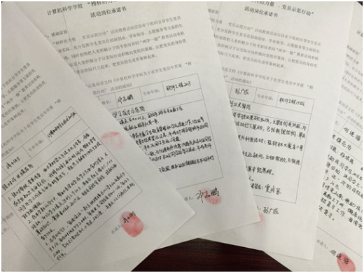 “我鄭重承諾本學期做到為同學解答相關的專業疑問,幫助團隊同學一起學習Java,達到基本熟悉的流程。”計科院學生第六黨支部學生黨員孫廣成在承諾書上鄭重簽上自己名字,面向支部成員做出承諾。