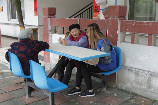隨后,大家分散到老人們居住和活動的地方與老人們聊天,認真傾聽老人們講述生活中的趣事以及人生經歷,與老人們一起下棋打麻將,并與老人們一起歌唱紅歌。