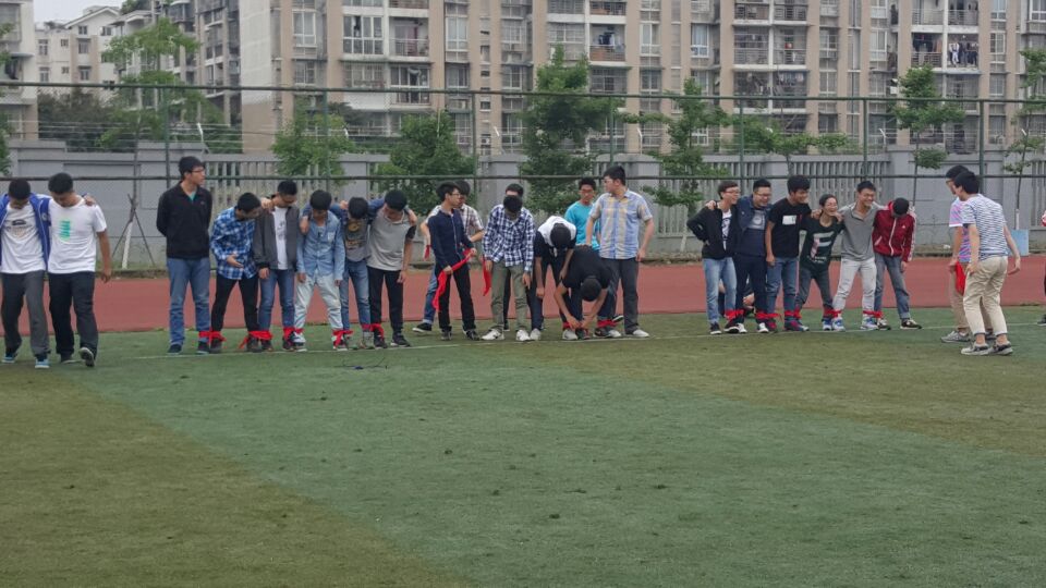 游戲規則為:兩個同學背靠背坐在地上,胳膊相互交叉,共同用力一起站起來,然后依次增加一個同學,直到不能再一起站起來為止。看似一個很有趣的小游戲,實際上包含著兩班班長希望我們所有同學能團結一致的想法。讓我們明白團隊協作的重要性,并增強我們的團隊歸屬感。