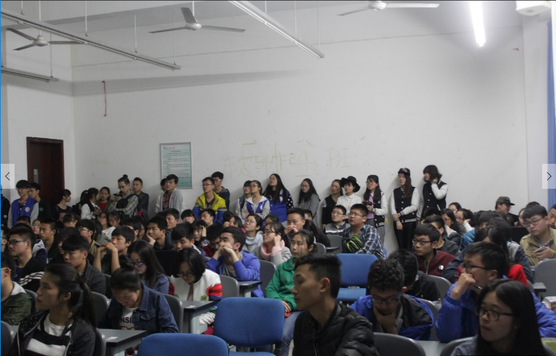 此次講座的主講人是來自繪話·多媒體制作團隊,圖片設計制作經驗豐富的講師王柯。這位曾經承接過飛翔獎封面制作和中海油企業畫冊制作等大型項目的主講人在講座開始前就備受同學們的期待。離講座開始還有半小時,場地就座無虛席了。主辦方特意拿來了椅子放在過道滿足后到的同學。