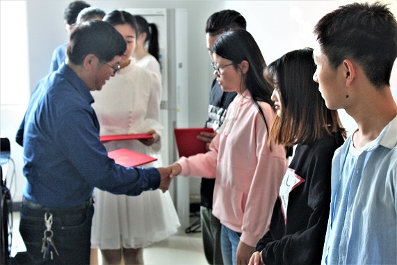 隨后,獲獎學生依次上臺領取獲獎證書,并與頒獎嘉賓合影留念。頒獎過程中,主持人一一介紹了獲獎學生的先進事跡。14級網絡工程獲獎者唐港迪的介紹中說到,“莫道君行早,更有早行者”,很好地詮釋了成功路上他異于常人的堅持與努力。介紹15級物聯網工程獲獎者鐘泠韻時,說到 “含淚播種的人,一定會含笑收獲。”告訴我們付出終有收獲,在場同學無不深受感染和激勵。喜歡吉他和唱歌、2016級軟件工程專業的張馨藝同學,奉行著“快樂且善良”的人生信條,在拼搏的道路上書寫著屬于自己的輝煌。在校歌《飛翔》的歌聲中,嘉賓與獲獎學生合影留念,一同分享成功的喜悅,現場氣氛活躍。