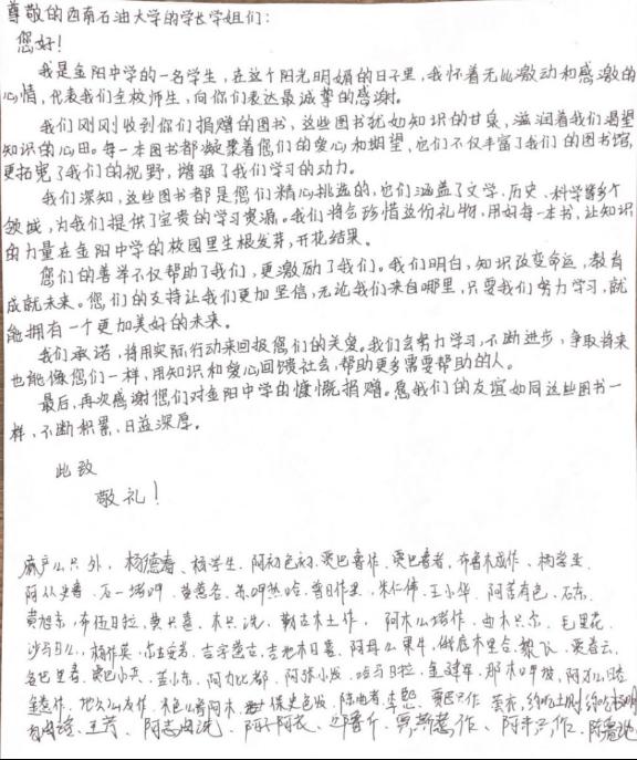 為豐富山區(qū)孩子們的精神文化生活,踐行社會責任,傳遞公益愛心,馬克思主義學院于5月29日成功開展“愛心包裹,書香傳遞”特色勞動實踐活動,向我校對口支援地區(qū)涼山州金陽縣金陽中學的學生們捐贈書籍,現(xiàn)收到金陽中學學生回信以致感謝。