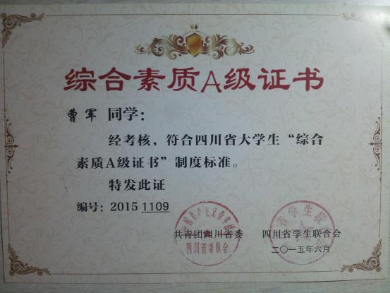 近年來,學院積極為學生搭建教學育人、實踐育人、活動育人與社會育人四大平臺,重視對大學生綜合素質的培養,涌現出一大批綜合素質高、實踐能力強、德智體全面發展的優秀學生。“大學生綜合素質A級證書”的認證工作對于培養具有學習能力、實踐能力、創新能力的綜合型人才,促進大學生綜合素質全面提高起到了積極的推動作用。此次曹軍、張秋陽兩名同學獲得2015年度“四川省大學生綜合素質A級證書”是學院全面實行素質教育的積極成果,將激勵更多同學不斷提高、不斷進步。