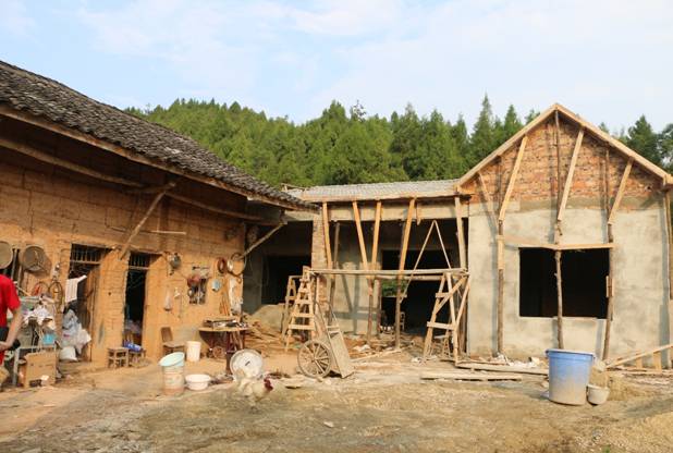 首先拜訪的是住在村委旁的一戶貧困家庭,這戶家庭家中只有兩位老人和他們的孫子,其兒子媳婦在外打工,奶奶患病癱瘓在床,爺爺因年邁不能照顧奶奶,所以孫子放棄在外打工賺錢的機會,在村里務農方便照顧兩位老人。他們積極響應國家扶貧政策,在政府的幫助和支持下,興修水泥房,其現居的土坯房與在建的水泥房形成巨大的對比,在采訪他們時,其孫表示很感謝國家有精準扶貧的政策,老百姓的生活水平肯定會逐步的提升,一時貧困,不代表一輩子都窮。在談話中不難發現他們都對以后的生活充滿了信心。