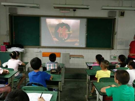 首先是由王紅州同學主講的思想教育課。課程開始,王紅州同學將國學經典中的儒家思想引入到課堂中,許多孩子們都能回答上儒學中的“五常”,讓老師很是驚喜。隨后,王紅州同學又通過各種故事詳細地講解了“五常”的內涵,在這個過程中國,還邀請孩子們參與進來,發表自己的看法。最后放了一段體現本次課堂內容的動畫視頻,技能吸引學生的注意力又能引起他們的思考。課堂在同學們的討論聲中結束了。