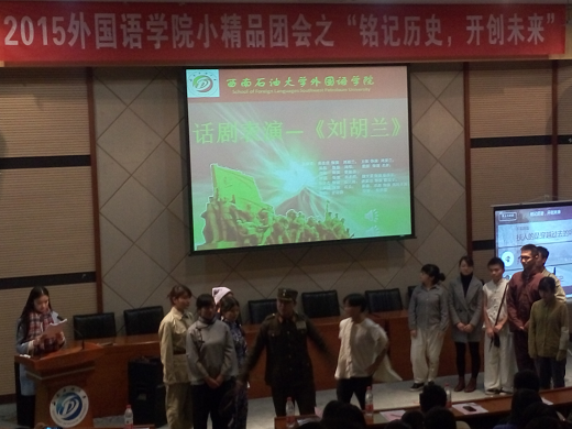 2015年12月4日晚七點半,西南石油大學外國語學院在思學樓A114舉辦了主題為“銘記歷史,開創未來”的小精品團會,以此紀念中國人民抗日戰爭和世界反法西斯戰爭勝利70周年。此次活動到場的嘉賓有校團委羅克維老師、外國語學院團委書記張志祥老師、院學生會主席代茂茹、院學生會秘書長胡敏倩以及院學生會各部長。