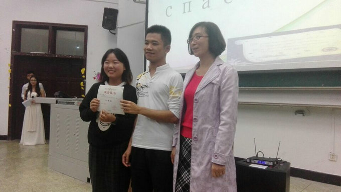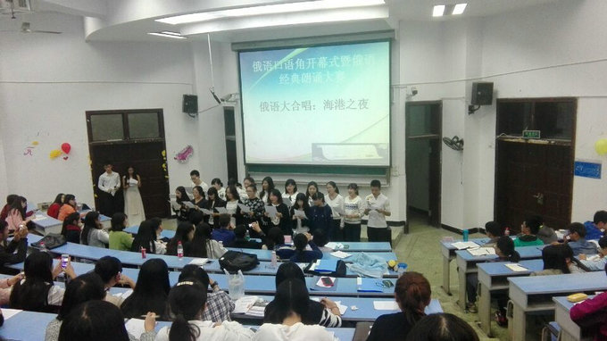在比賽進行過程中,14級俄語二班的同學們為大家帶來了精彩的俄語繞口令表演,15級俄語專業學生鄧博文、袁一圖共同演唱了好聽的英文歌曲《sparks fly》,現場氣氛一度達到高潮。最后,14級俄語一班的同學們深情演唱的俄語歌曲《海港之夜》為此次朗誦比賽畫上圓滿的句號。