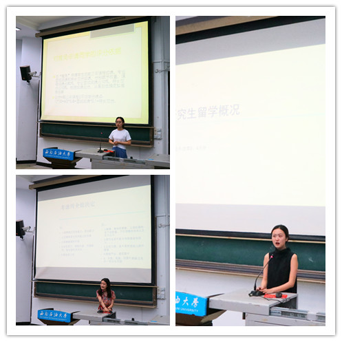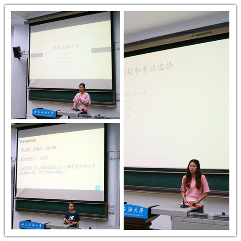 接著,幾位考研深造成功的優(yōu)秀學子分享了她們的深造經歷和學習經驗。她們以優(yōu)異的成績分別考入了英國杜倫大學、法國南錫高等商學院、四川大學、西南大學、四川外國語大學、西南政法大學。王玲同學就英國留學概況、申請材料準備以及其它前期準備做了重點介紹;劉雪晴同學分析了出國留學的利弊及注意事項;李佳琳同學分享了成功保研的經驗;李沁芮同學講解了考研科目的具體備考方法;朱玉梅同學講述了報考院校和專業(yè)的選擇、相關資料的收集以及備考的過程與方法,并代表她所在的“學霸寢室”的全體成員分享了她們寢室良好的學習氛圍;徐靜同學也談論了自己跨專業(yè)考試的準備與詳細安排。