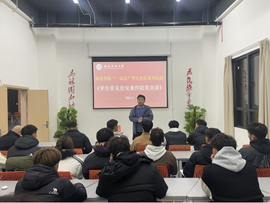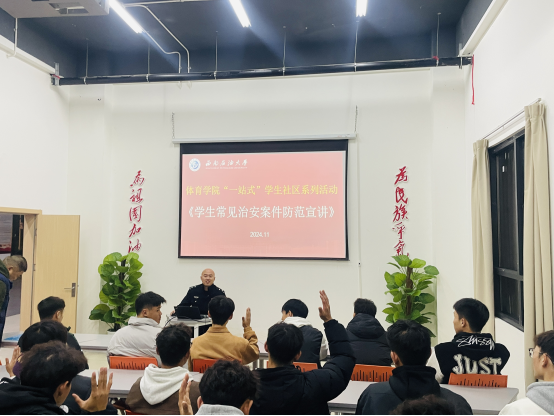 為增強學生安全防范意識,營造和諧穩定的校園環境,11月27日晚,體育學院在修齊居多功能室開展“一站式”學生社區系列活動之《學生常見治安案件防范宣講》。成都市公安局新都區分局桂林派出所程從景警官主講,體育學院輔導員汪佳材主持。