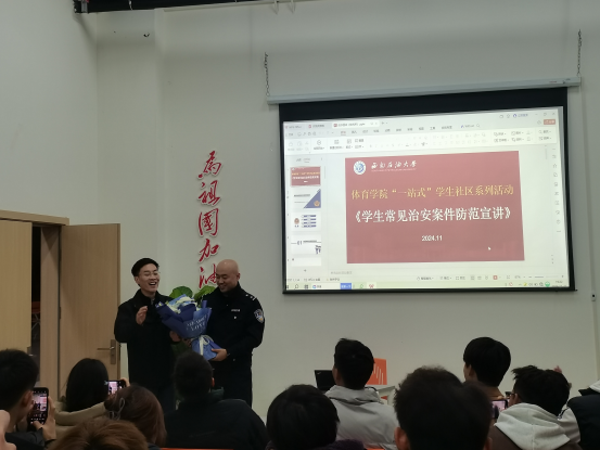 最后,體育學院輔導員汪佳材總結并代表我院為程警官送上花束以表感謝。汪佳材表示,學院將繼續加強校園安全管理,通過舉辦一系列活動,提高同學們的安全防范能力,為創建平安校園貢獻力量。