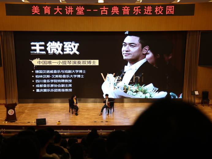 為進一步做好新時代學校美育工作,深化美育工作培根鑄魂的戰略地位,以美育人、以文化人,全面提高學生的審美和人文素養,2021年4月19日晚19點,由黨委學生工作部、教務處、校團委主辦,藝術學院承辦的“美育大講堂,古典音樂進校園”音樂交流會在圖書館學術報告廳順利舉行,本次交流會有幸邀請到了柏林漢斯-艾斯勒音樂大學、德國漢諾威音樂與戲劇大學的雙料博士、成都音樂家協會副主席、重慶愛樂團客座教授、海歸小提琴演奏家王微致博士為我們帶來一場聽覺盛宴。校黨委副書記衡彤、郭世一,組織部、學工部、教務處、校團委、藝術學院相關領導親臨活動現場。
