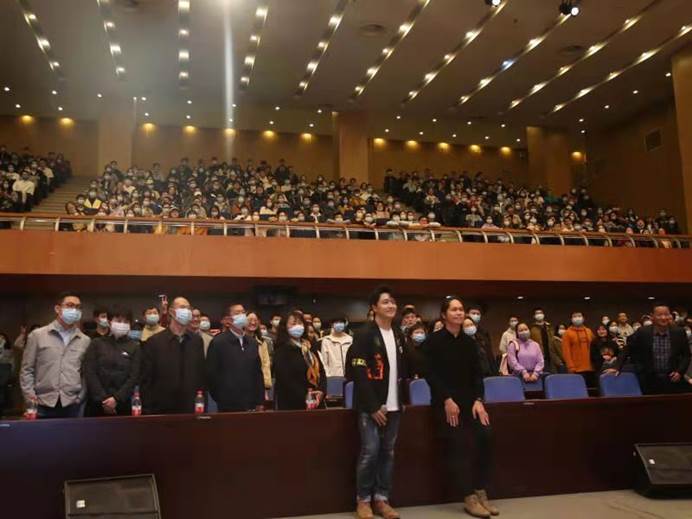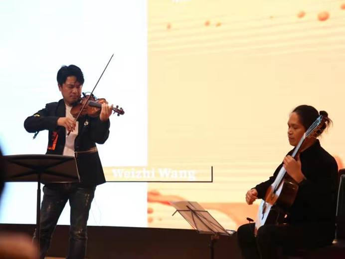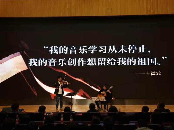 交流會開始后,主持人通過與王致微博士的訪談對話讓我們加深了對古典音樂和小提琴的認識理解,王微致博士以幽默風趣的語言和余音繞梁的演奏技藝讓同學們感受小提琴演奏的魅力,現場掌聲、歡笑聲不斷,氣氛十分熱烈。訪談結束后,王微致博士和他的搭檔帶來了小提琴吉他協奏曲目《天下》、《十面埋伏》、《我和我的祖國》等,時而婉轉悠揚、時而氣勢恢宏,王致微博士通過忘情的演奏、搖擺的身影、精湛的指法讓全場觀眾感受到了古典音樂的深厚底蘊,以聲傳情、以樂入心,讓在場觀眾完全投入到音樂編織的理想世界。表演結束后整個大廳響起了此起彼伏的掌聲和贊嘆。隨后來到觀眾提問的環節,王致微博士分享了他的學習經歷和成長經驗,讓同學們深刻認識到成功并非一蹴而就,“寶劍鋒從磨礪出,梅花香自苦寒來”。最后在一張大合照里,本場深入人心、意猶未盡的音樂交流會圓滿結束。