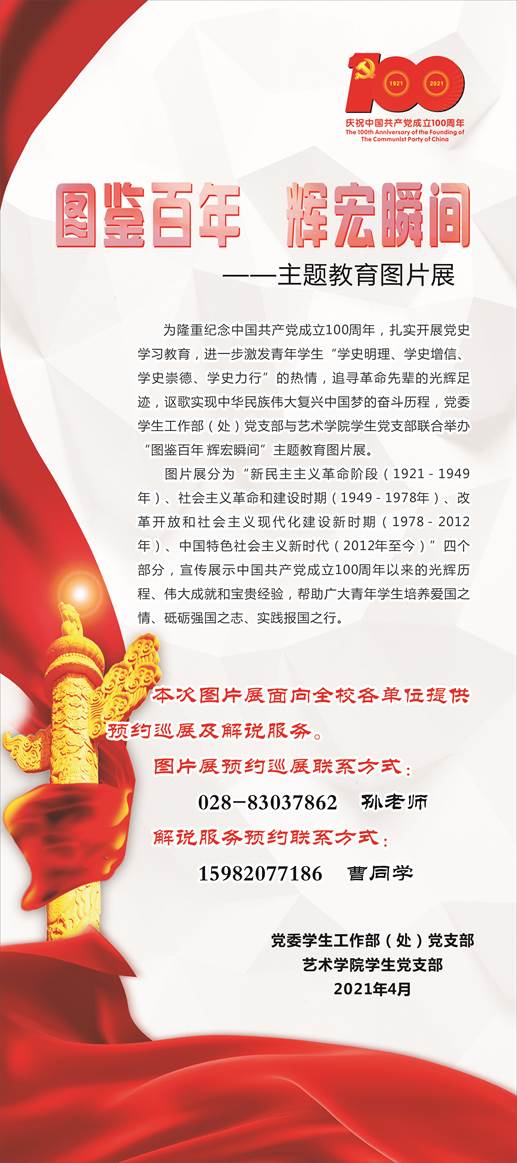 為深入貫徹落實習近平總書記關于黨史學習教育的重要論述,扎實開展黨史學習教育,進一步激發大學生“學史明理、學史增信、學史崇德、學史力行”的熱情。4月20日,由黨委學生工作部(處)黨支部與藝術學院學生黨支部聯合舉辦的“圖鑒百年,輝宏瞬間”黨史學習教育主題圖片展在博學廣場拉開帷幕。