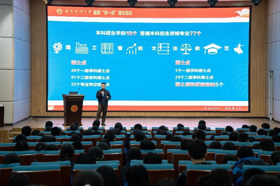 宣講分為兩部分,首先對全體學(xué)生宣講西南石油大學(xué)的概況,包括生活條件、學(xué)校環(huán)境、教學(xué)資源等等。這部分宣講引起了廣大高中學(xué)子們的極大興趣,大家對西南石油大學(xué)表現(xiàn)出了強(qiáng)烈的興趣。