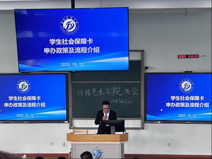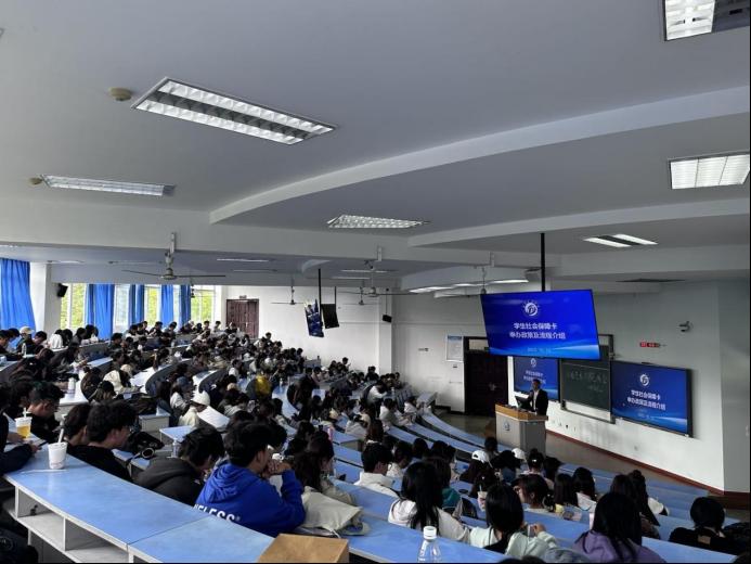 李安然詳細介紹了社會保障卡是什么、醫保卡的作用、為什么要辦醫???、辦理醫??ㄋ栀Y料、辦理醫??ǖ牡攸c及方式。此外,他說明了獎助學金的發放渠道。在最后的提問環節中,李安然耐心地解答了同學們的問題,比如已持有社會保障卡的同學,此次是否還需重新申領,他便從三種不同情況進行了回答,即成都市區域內的學生、四川省內成都市區域以的學生外、外省籍的學生三種情況,幫助同學們更好地去做好相關事宜。