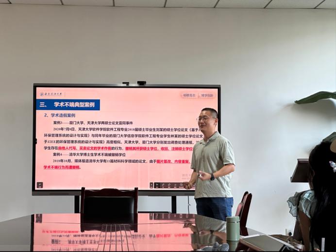 科研誠信是科學研究的基石,它關系到科學成果的真實性、可靠性和可信度。為進一步提高藝術學院2023級碩士研究生新生的學術道德水平,加強誠信意識,9月13日上午,藝術學院2023級碩士研究生“科學家精神與科學道德”學術道德主題講座在藝術樓306會議室舉行。廣播電視編導教研室教師、碩士生導師張一驄主講,2023級碩士研究生輔導員曹大偉主持,2023級全體碩士研究生參會。