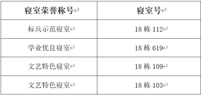 以“貼近學生、貼近實際、貼近生活”為指導,本著公平、公正、公開的原則,本次“寢室掛牌”活動評選出標兵示范寢室1個、學業優良寢室1個、文藝特色寢室2個,具體掛牌寢室信息見下表: