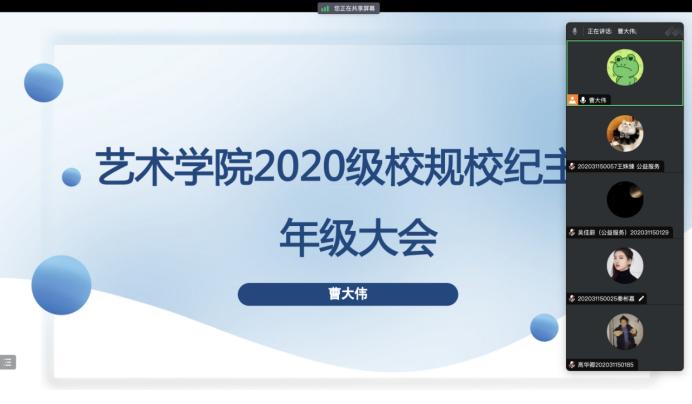 為進一步強化學生紀律觀念,推動學生加深對校紀校規的認知,規范學生的日常行為習慣,11月8日-11月19日,藝術學院各個年級輔導員分別召開校紀校規教育年級大會,推動規矩意識在學生中入腦、入心、入行。
