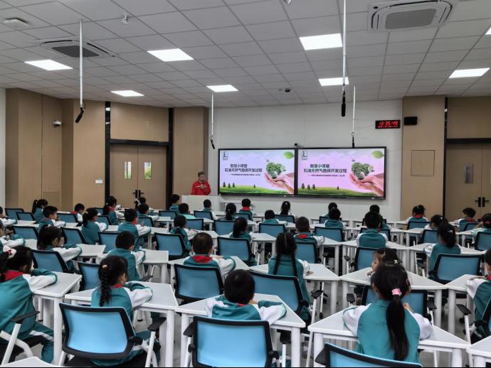 中石化西南石油工程公司鉆井一分公司講解員開展“石油天然氣勘探開發過程智慧小課堂”,借助動畫視頻、圖片進行生動講解,包括石油的形成、石油的歷史以及石油在生活中的應用,引導學生深刻認識石油是不可再生能源,節約能源、低碳生活勢在必行。講解員補充講述現代石油工業的發展歷程,并以石油人物王進喜的“打出大慶第一口油井”“用身體制服井噴”的故事、“寧可少活20年,也要拿下大油田”等口號,詮釋石油精神的深刻內涵,在學生們心中埋下“石油人·石油魂·石油情”的種子。