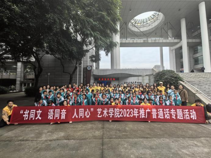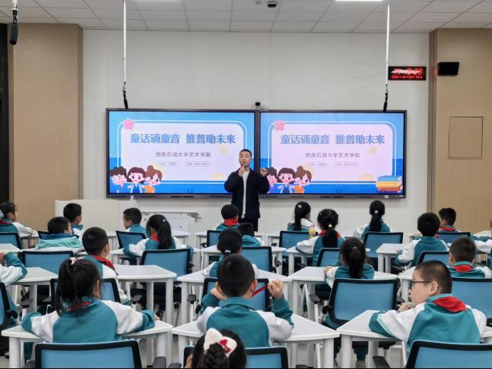 藝術學院立足專業特色,開展“書同文 語同心 人同音”推廣普通話專題活動。在“童話誦童音 推普助未來”推普講座上,播音主持藝術專業學生主講員鄧亞波進行全面講解和趣味問答,幫助學生們矯正部分字音,引導他們充分認識到說普通話的重要性,增強學生認真學習普通話的意識,讓大家在優良教學氛圍中品味到語言文字和傳統文化之美。