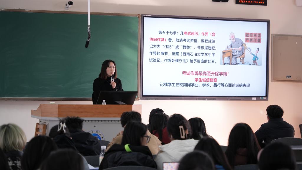 朱蕊強調誠信考試是每個學生應具備的最基本的道德守則,是必須遵守的原則和底線。她重申違紀處分管理辦法、違紀典型案例警示教育、《西南石油大學學生考試違紀、作弊處理辦法》以及考試注意事項解讀,充分提醒同學們要合理規劃期末考試季的復習時間,認真備考,誠信參加考試,杜絕一切作弊行為,共同營造公平公正的考試環境。她表示,誠實守信是中華民族的傳統美德,現代社會更需要誠實守信。大家應當反對虛假和不守信用的行為,反省自己不誠實不守信的行為,做一個誠信的大學生。做到誠信考試,爭做文明考生。