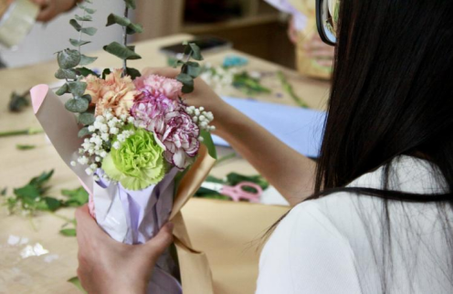 工具準備完畢,同學們進入插花環節。以花為材,修剪花枝,整理花朵,包裝花籃。修剪、整枝、拼插、包裝,修剪花枝、花葉,精準把握尺寸,同學們從手忙腳亂逐漸得心應手。
