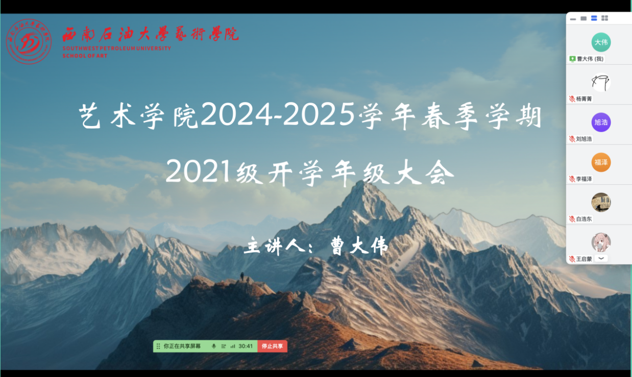 2021級年級大會由曹大偉老師主持召開,2021級學生已步入大四下學期,正值畢業關鍵期。曹大偉老師在年級大會上詳細分析了畢業前的重點事項,并針對就業形勢提出建議,鼓勵學生合理規劃未來。他勉勵學子傳承“德藝周厚,知行合一”的院訓精神,祝愿他們擁有光明前程。