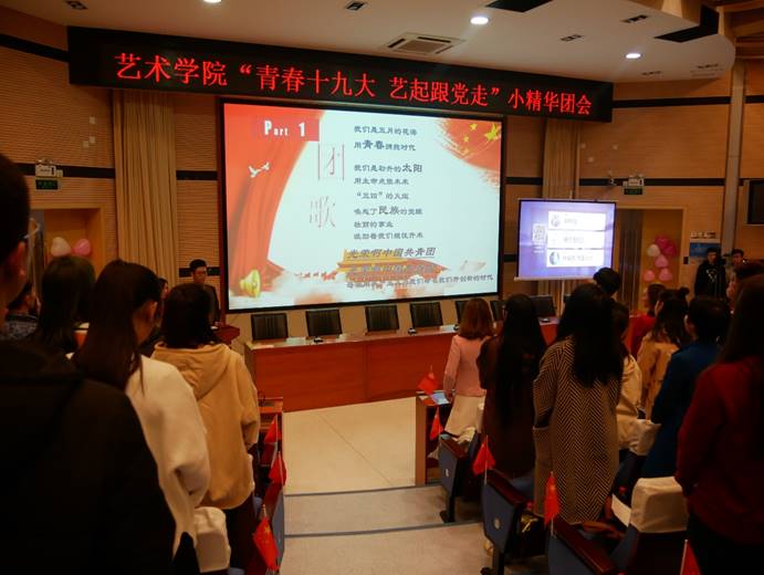 十九大剛剛過去不久,認真學習黨的十九大精神,是我們首要的政治任務。為使十九大精神深入到同學們的學習生活中,藝術學院于2017年11月16日晚在思學樓A114召開“青春十九大藝起跟黨走”小精華團會。蒞臨本次團會的有校團委蒲彥羽老師、藝術院團總支書記何姍老師以及外院的評審團們,同時2017級全體同學參與了此次團會。