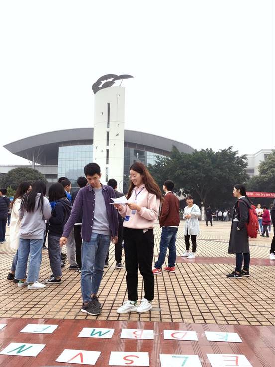 由我院易班負(fù)責(zé)的游戲環(huán)節(jié)是“易”起奔跑。參賽人員必須站在黃線處,工作人員說出一個中文及其詞性,參賽者需立即按照順序跑到對應(yīng)的英語單詞字母處彎腰觸摸,且需在30秒內(nèi)正確完成則第一輪成功。第二輪游戲需在40秒內(nèi)正確完成則第二輪成功。兩輪成功則可獲得橙色印章。現(xiàn)場參與者玩的不亦樂乎,他們的歡聲笑語甚至引來了周圍的民眾以及小朋友們參與其中,現(xiàn)場氣氛火爆異常,歡樂無比。