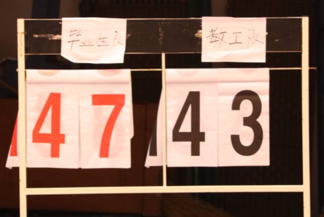 比賽開始,畢業生隊搶先獲得進攻機會,逼至教師隊籃筐區域,老師們防御成功,畢業生隊暫失進球機會。到了上半場快結束時,畢業生對以21比10的優勢領先于教師隊。教師隊不急不躁,開展以攻為主的戰術成功將雙方比分再次拉至平分。下半場開場后,畢業生隊加大進攻力度,教師隊沉著應對,比賽進入拉鋸戰。在短暫停止的換隊員上場時間過后,教師隊迎來了對方如狂風驟雨般的攻勢,隨著長距離傳球至籃筐附近隊員、中場進球被畢業生們完成,比分也再次拉開差距。面對這樣的形勢,教師隊抓緊機會從畢業生隊員的手中爭奪籃球控制權,多次進球。最終畢業生隊贏得本次師生籃球聯誼賽的桂冠。