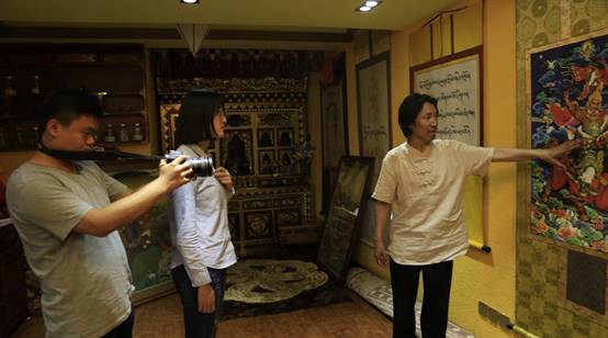 “看鐵馬踏冰河,絲線縫韶華,紅塵千帳燈。”拉孟老師熱情的接待了來(lái)訪的同學(xué)們,并帶領(lǐng)同學(xué)們參觀了許多精美的畫(huà)作。期間,拉孟老師更是詳細(xì)的講解了唐卡文化,使同學(xué)們對(duì)這一類畫(huà)派有了更深入的了解,從拉孟老師的話語(yǔ)中我們聽(tīng)出了他對(duì)唐卡熱愛(ài)與癡迷,也聽(tīng)出了他對(duì)這一非物質(zhì)文化遺產(chǎn)傳承的重視。他希望透過(guò)同學(xué)們的紀(jì)錄片讓更多人了解這一畫(huà)派,并讓這非物質(zhì)文化遺產(chǎn)能夠繼續(xù)傳承下去。