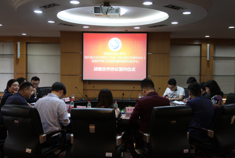 5月3日上午10:30,四川省文化廳劇目工作室及成都市錦江區壹加壹戲劇交流中心與藝術學院于西南石油大學行政樓810會議室舉行戰略合作簽約儀式,并就雙方合作事宜開展了深入的探討。四川省文化廳劇目工作室主任丁鳴、副主任陶華,創評室主任杜林,壹加壹戲劇交流中心法人代表楊心先與西南石油大學藝術學院分管校領導何沙、藝術學院黨總支書記李忠偉、副院長林莉、辦公室主任王隆、實驗室主任崔炯屛、藝術學院各教研室老師作為雙方代表出席活動,副院長林莉主持會議。