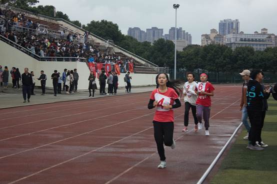 賽場上運動員們在奮力奔跑,觀眾臺上藝術學院的同學們為她們加油助威,跑道上,運動員揮灑著自己的汗水,堅持不懈,直到沖到終點的那一刻。