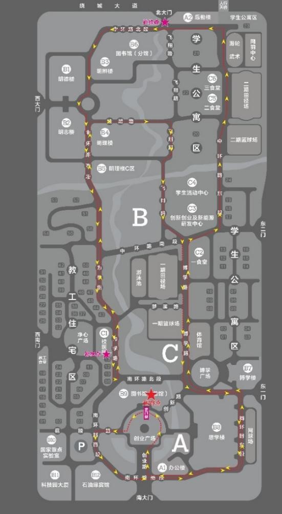 跑步路線:環(huán)校公路共6.6公里。路線串聯(lián)校園內(nèi)多個重要地標和景點,讓參賽者在奔跑中感受學校的歷史底蘊和文化魅力。