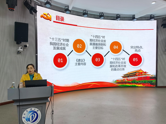 蔣朝莉從五個方面為學員們做了全面、準確、深入的講授。首先,蔣朝莉通過各類數據展現“十三五”期間我國在脫貧攻堅、生態文明、社會保障、對外開放、健康中國等方面的經濟社會發展成就。按照總論、分論、結尾三個角度分析講解《中共中央關于制定國民經濟和社會發展第十四個五年規劃和二〇三五年遠景目標的建議》主要內容,強調“十四五”時期經濟社會發展要遵循五個原則和六個主要目標,指出“十四五”時期經濟社會發展和改革開放的十二個方面的重點任務。突出“十四五”規劃廣開言路、問計于民、科學嚴謹的特點和發展為了人民的亮點。最后,蔣朝莉為學員分析中國高等教育邁入普及化階段的發展趨勢。