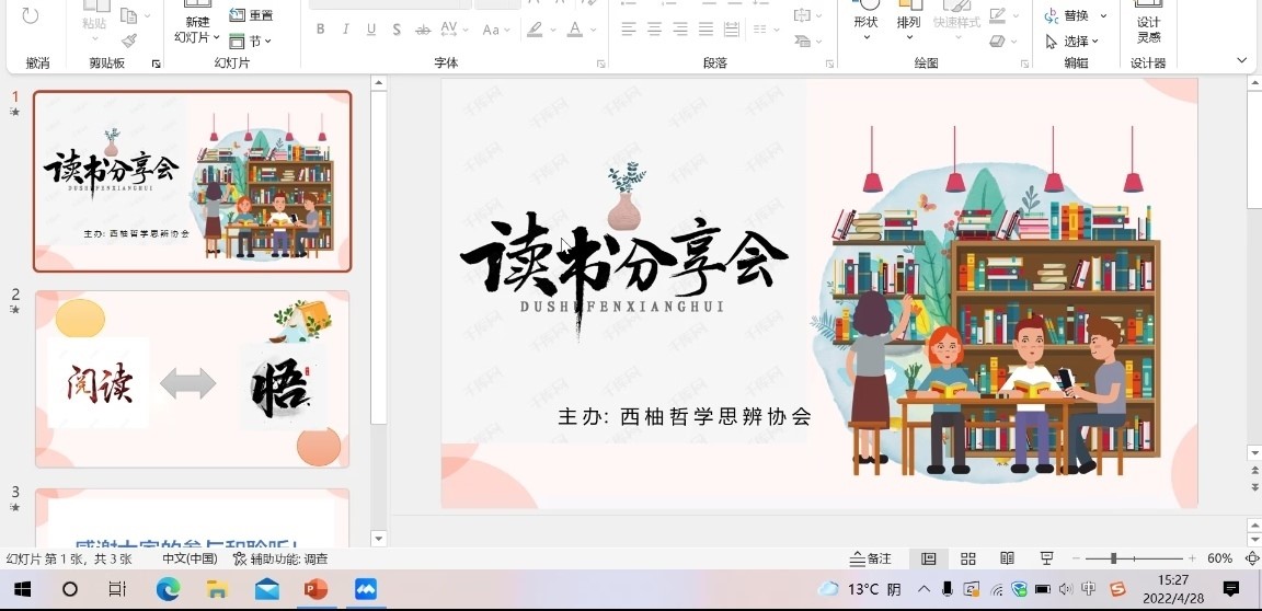 為激發同學們的讀書熱情,交流讀書感悟,分享讀書心得,2022年4月28日下午,西柚哲學思辨協會在騰訊會議舉辦了線上的讀書分享會。雖然是線上會議,但同學們的熱情勢不可擋,吸引了廣大熱愛讀書的同好參會交流。會議在靜謐的室內、聲流的入耳傳送中拉開了序幕。