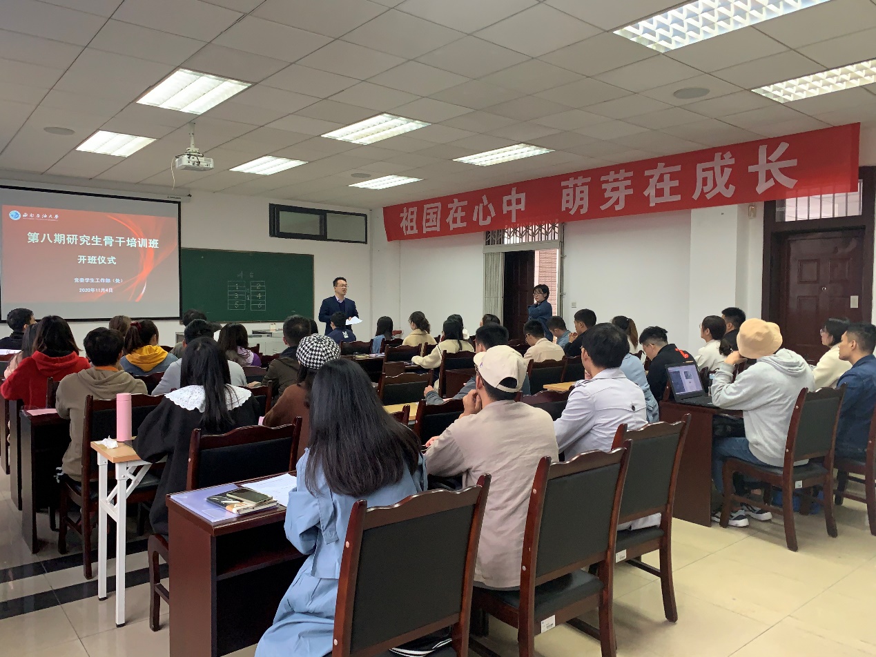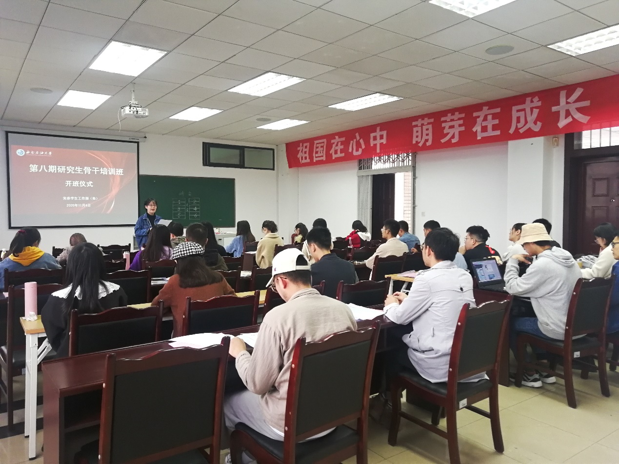 2020年11月4日下午15:00,我校第八期研究生骨干培訓班開班儀式在思學樓A501順利舉行,黨委學生工作部(處)研究生工作辦公室秦海洋老師和廖然老師以及全體參培學員參加了開班儀式。