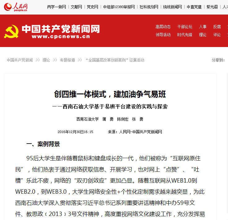 我校學(xué)生工作部(研究生工作部)易班發(fā)展中心蒲勇、陳俐宏、張勇撰寫的“創(chuàng)四維一體模式,建加油爭(zhēng)氣易班”工作案例,入選全國(guó)基層改革創(chuàng)新案例正在人民網(wǎng)進(jìn)行全面展示。